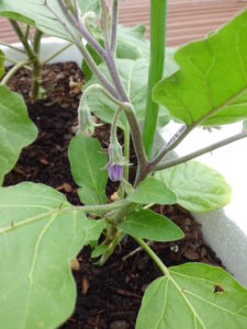 ナスは2種類植えました。 Bonikaというニュージーランドのスーパーでよくみかける大きめナスと Dokという日本でよくかける長ナスです。 この長ナス、苗選びの時一つのポットに弱そうな2本出てる物を買いました。うまく育てば2倍収穫!と思ったのですが育ちが悪いのとお互いの葉があふれてたので一本根元から切りました。コンパニオンプランツとして相性がいいらしいねぎも一緒に育ってます。 血気盛んなBonikaと一緒に植えたねぎはいつの間にやら消えてしまいました。 そんな長ナスも初つぼみ発見!まだまだ弱弱しい枝ですが大きくなるといいな~。