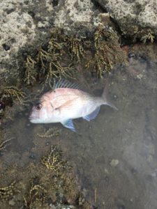 で岩場をあるくこと15分。釣りを始めてわりとすぐに30センチの鯛が釣れました。しかし、雨も降ってきて足場もわるくなってきたのであっさり帰路につきました。