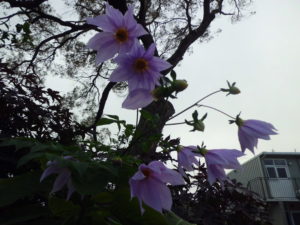 こちら近所に咲いていた花。雨にぬれて花びらが重そう。