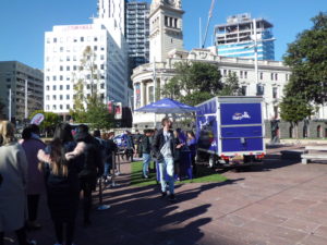 なにやら流行りのポップな音楽が流れているので近づいてみると、カドバリー社は無料チョコレート配布をしてました。
